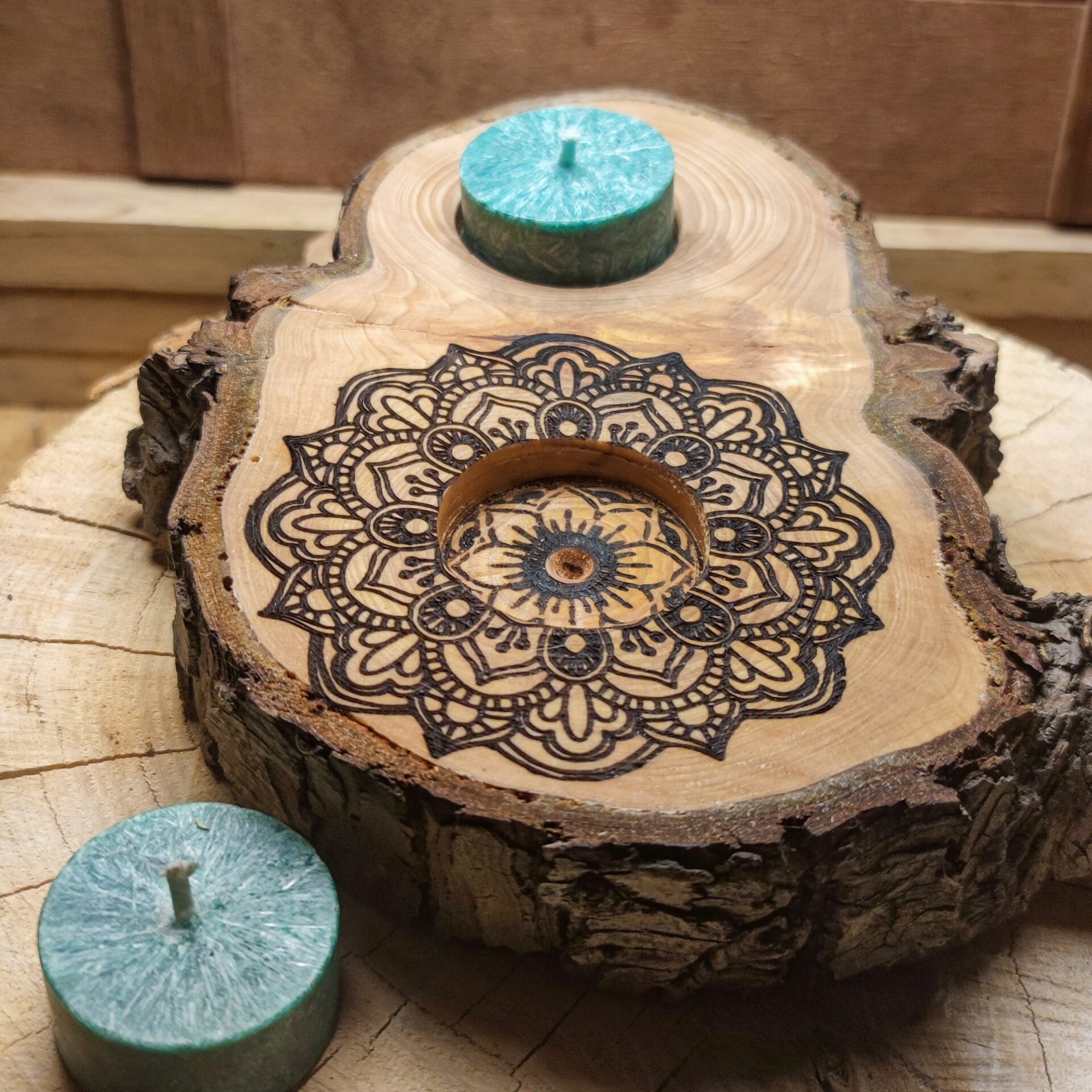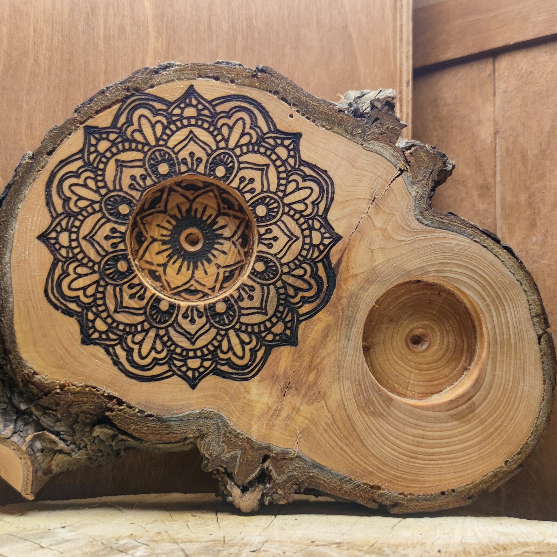 Anhänger aus einer Astscheibe vom Lebensbaum mit Blumen- Mandala Gravur