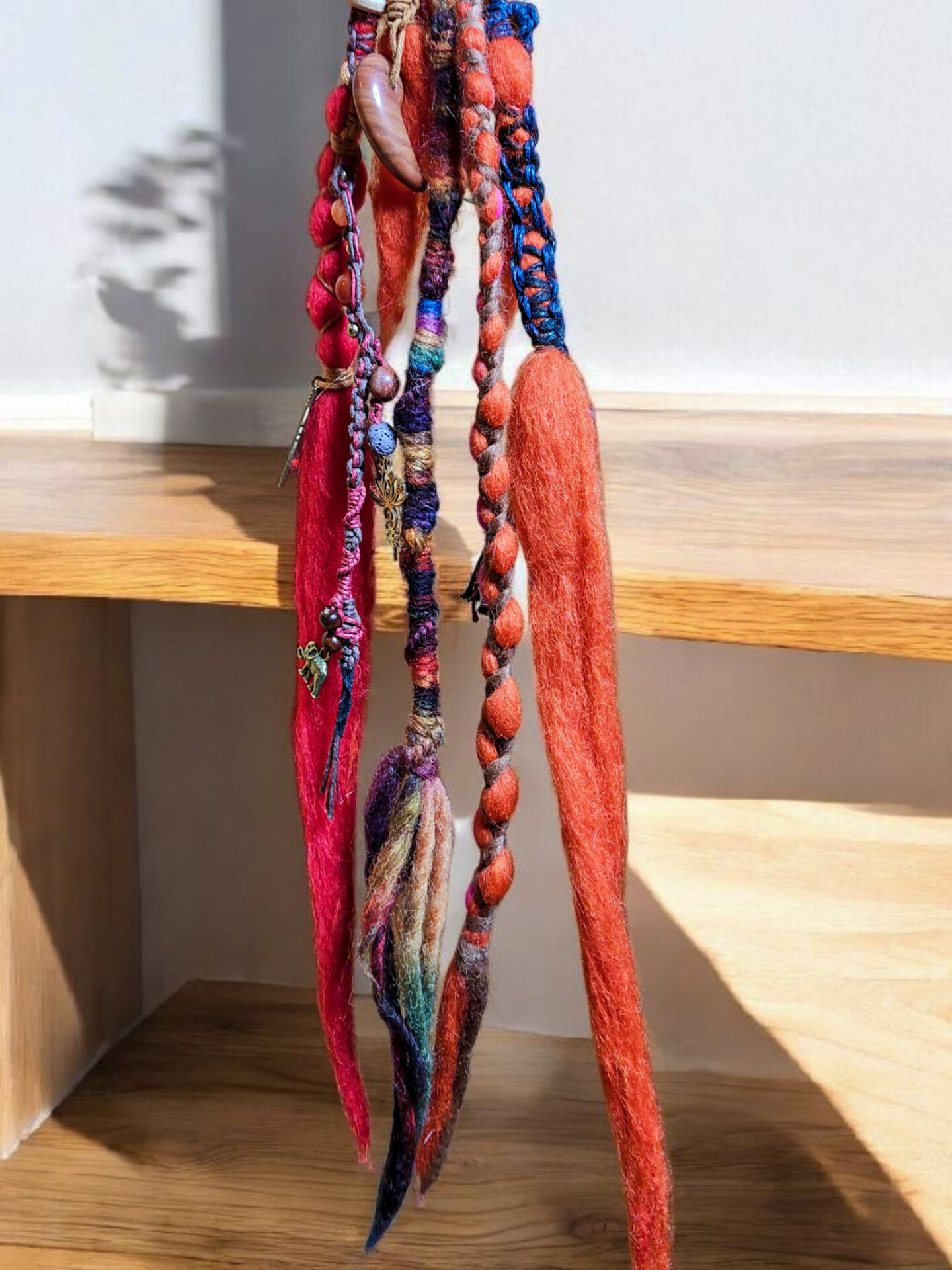 Drei liebevoll gestaltete Filzdreads an einer Schlaufe, in kräftigen Rot- und Erdtönen, fangen das Feuer des Herbstes ein und bringen natürliche Energie in dein Haar.