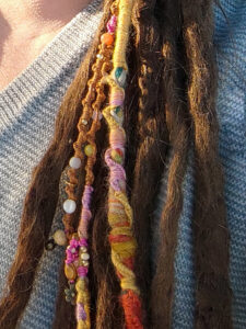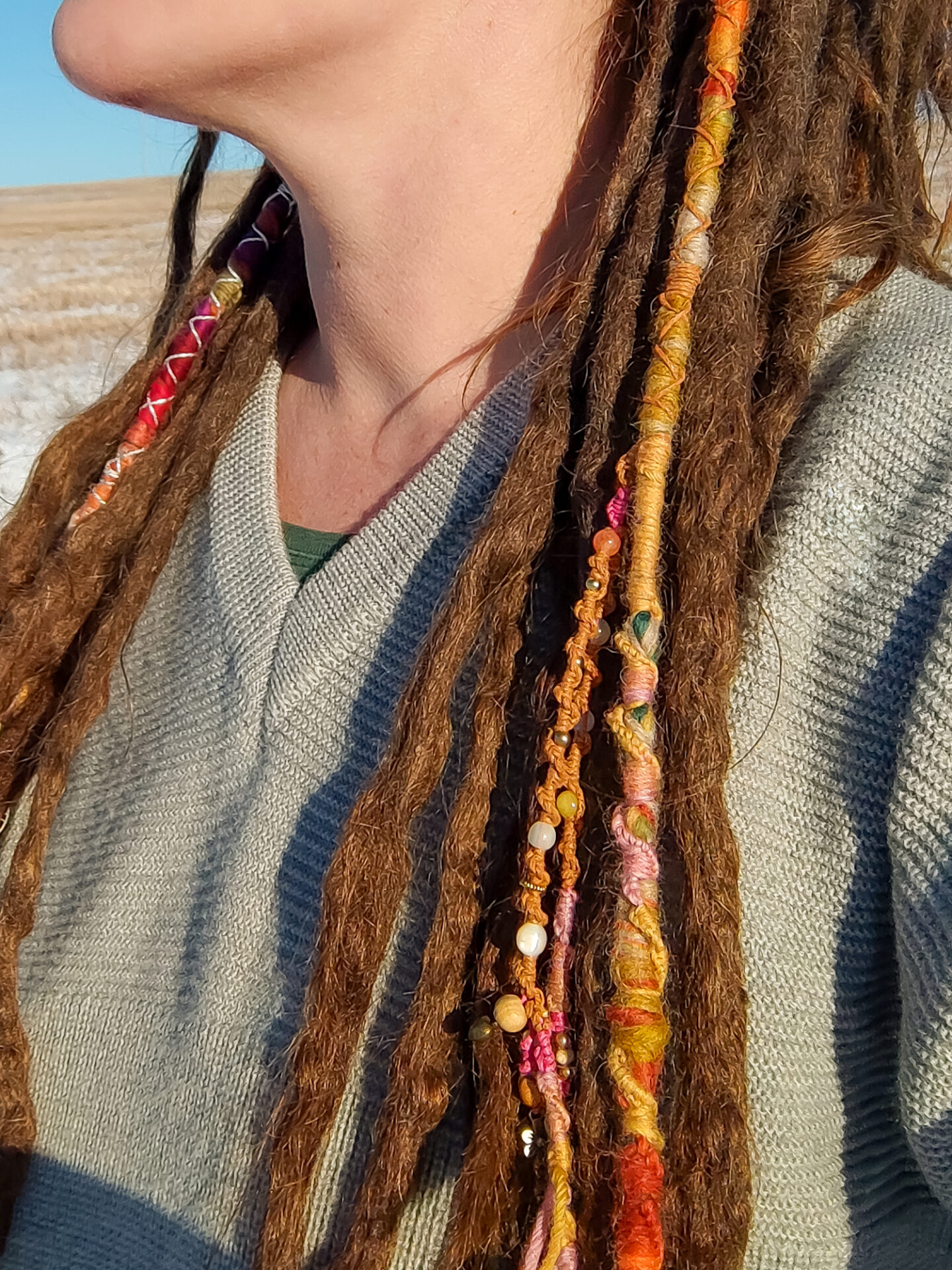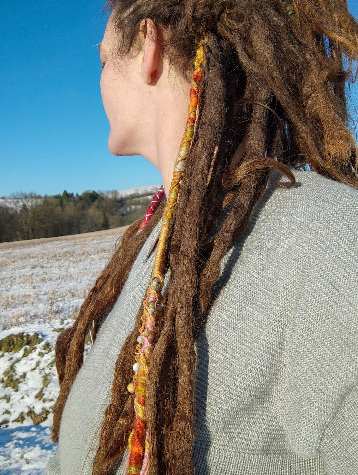 Dieses Produkt ist für die Nutzung als Haarschmuck / Dreadschmuck bestimmt. Du kannst den Dread/ Dreadwrap mit der Schlaufe in deine eigenen Haare flechten, über deine eigenen Dreads hängen, oder mit einer Haarspange, oder einem Haargummi befestigen.