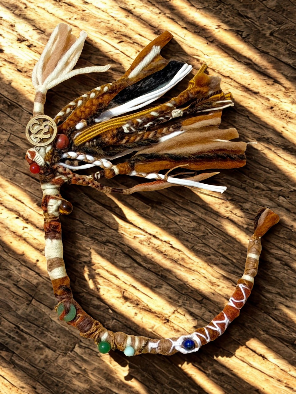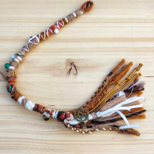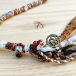 Dreadwrap – Unikat- in warmen Sand- & Erdtönen (Naturfarben), mit Chakra – Steinen & Om Anhänger